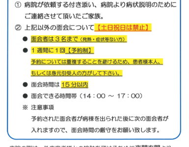 2024年4月2日, 4:54 PM 2024年4月2日 お知らせ お知らせ【面会再開について】 投稿が遅くなり申し訳ございません。3月21日(木)から制限付きで面会を再開しています。週1回の予約制 …