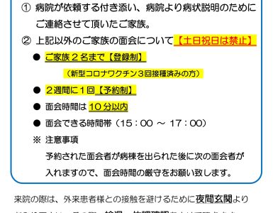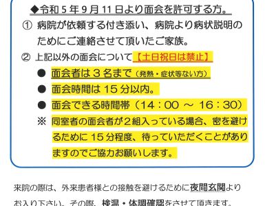 2023年5月17日, 9:08 AM 2023年5月17日 お知らせ 【お知らせ】5月22日(月)より面会制限が緩和されます 5月22日(月)より下記の通り面会制限が緩和されます。 主な変更は①面会者は3名まで②1週間に1回と …